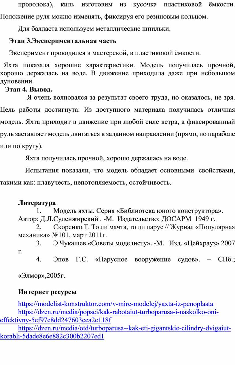 4.Сделать вывод о результатах проведенной работы по созданию действующей модели роторной яхты.