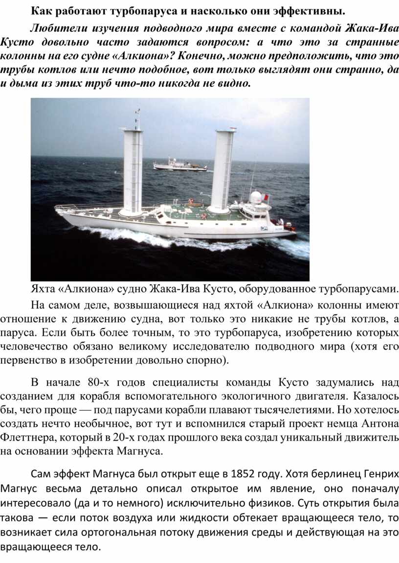 Яхта «Алкиона» судно Жака-Ива Кусто, оборудованное турбопарусами.