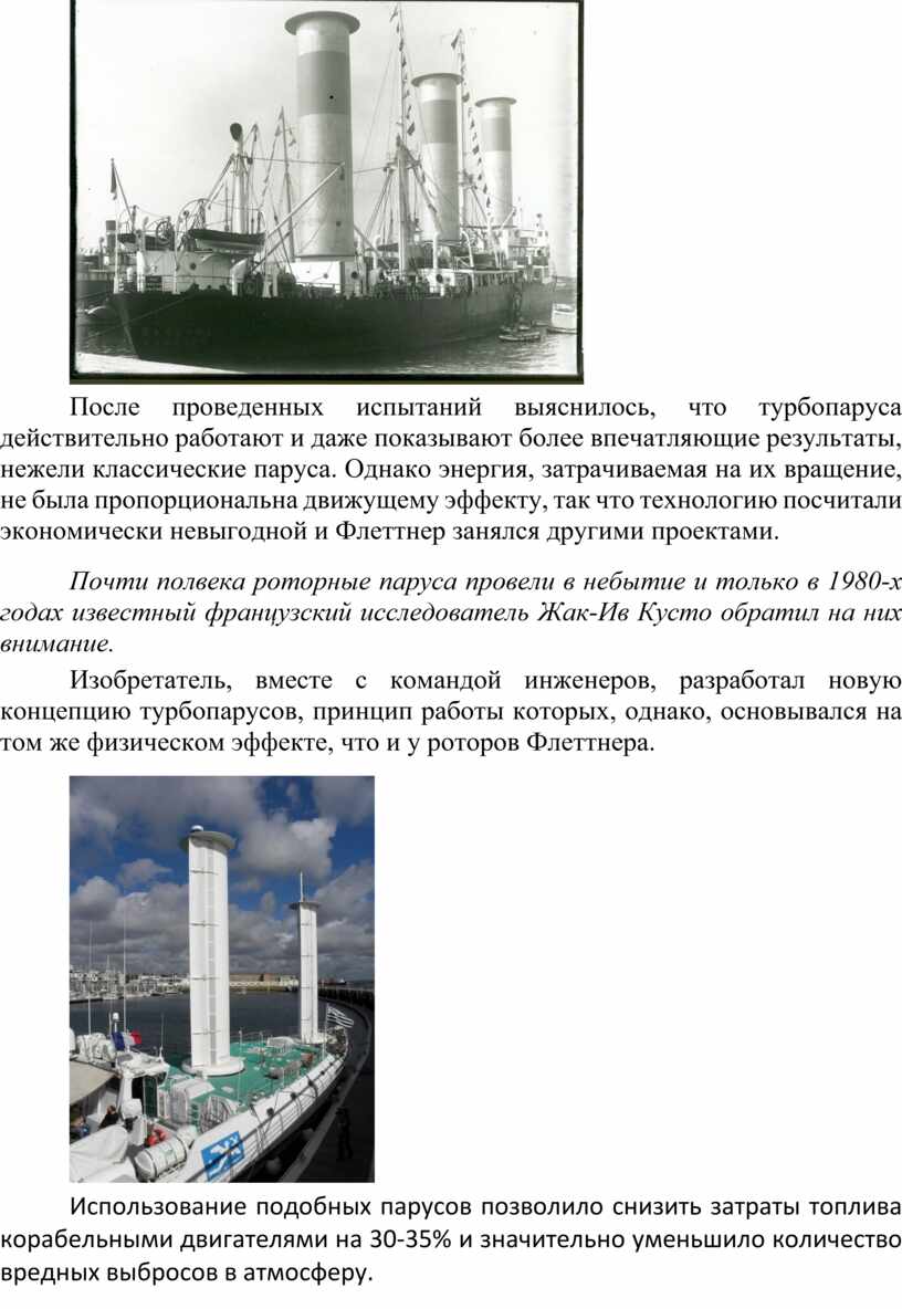 Почти полвека роторные паруса провели в небытие и только в 1980-х годах известный французский исследователь Жак-Ив Кусто обратил на них внимание.