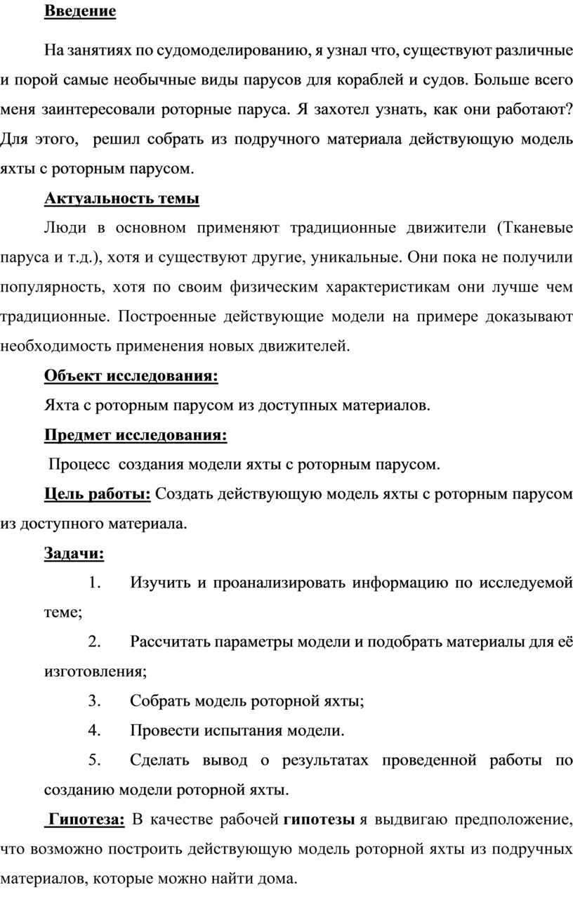 Гипотеза: В качестве рабочей гипотезы я выдвигаю предположение, что возможно построить действующую модель роторной яхты из подручных материалов, которые можно найти дома.