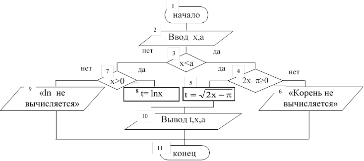 4. для вычисления переменной t по формуле соответствующей условию х³а необходимо дополнительно проверить условие х>0, иначе вывести сообщение «логарифм не вычисляется».