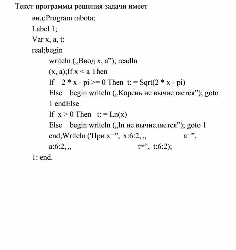 Else begin writeln („ln не вычисляется‟); goto 1 end; Writeln ('При х=‟, x:6:2, „ a=‟, a:6:2, „ t=‟, t:6:2);