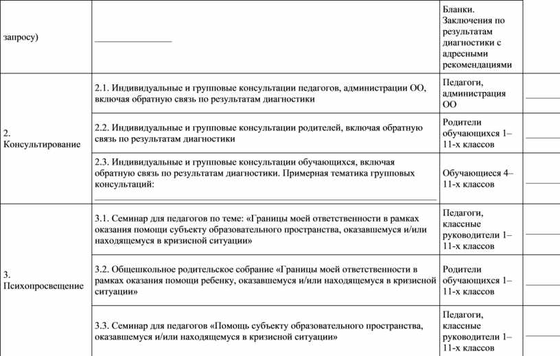 2.1. Индивидуальные и групповые консультации педагогов, администрации ОУ, включая обратную связь по результатам диагностики. Примерная тематика: ________________________________________________________________________________________________ |