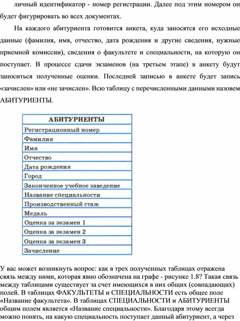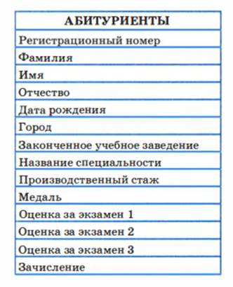 На каждого абитуриента готовится анкета, куда заносятся его исходные данные (фамилия, имя, отчество, дата рождения и другие сведения, нужные приемной комиссии), сведения о факультете и специальности, на которую он поступает. В процессе сдачи экзаменов (на третьем этапе) в анкету будут заноситься полученные оценки. Последней записью в анкете будет запись «зачислен» или «не зачислен». Всю таблицу с перечисленными данными назовем АБИТУРИЕНТЫ.