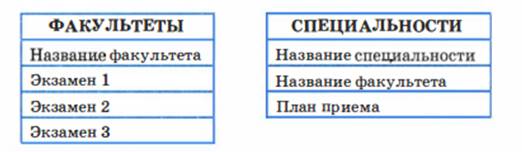 Таблицы 1.1 и 1. 2 представляют собой экземпляры таблиц ФАКУЛЬТЕТЫ и СПЕЦИАЛЬНОСТИ. При описании структуры таблицы достаточно указать ее имя и перечислить заголовки всех столбцов.
