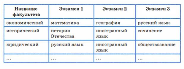 На первом, подготовительном этапе от нашей информационной модели в первую очередь потребуются сведения о плане приема в университет: на каких факультетах какие специальности от крыты для поступления; сколько человек принимается на каждую специальность. Кроме того, абитуриентов (и их родителей) интересует, какие вступительные экзамены сдаются на каждом факультете, какие засчитываются по результатам ГИА.