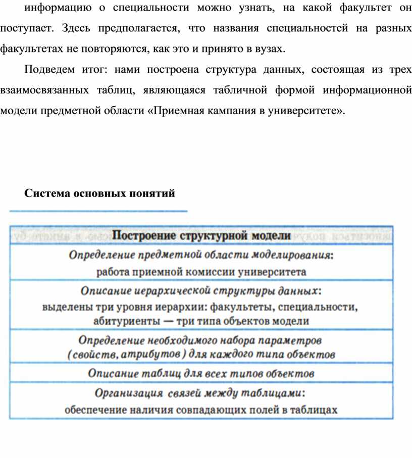 Подведем итог: нами построена структура данных, состоящая из трех взаимосвязанных таблиц, являющаяся табличной формой информационной модели предметной области «Приемная кампания в университете».
