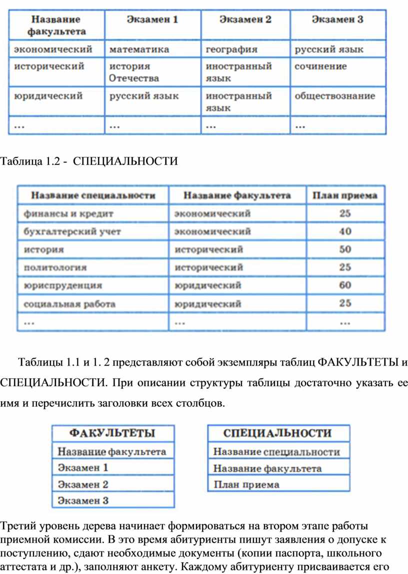 Для каждого уровня дерева 1 .8 создается таблица своего типа. Вот как выглядят таблицы для уровней факультетов и специальностей (табл. 1.1 и 1.2).