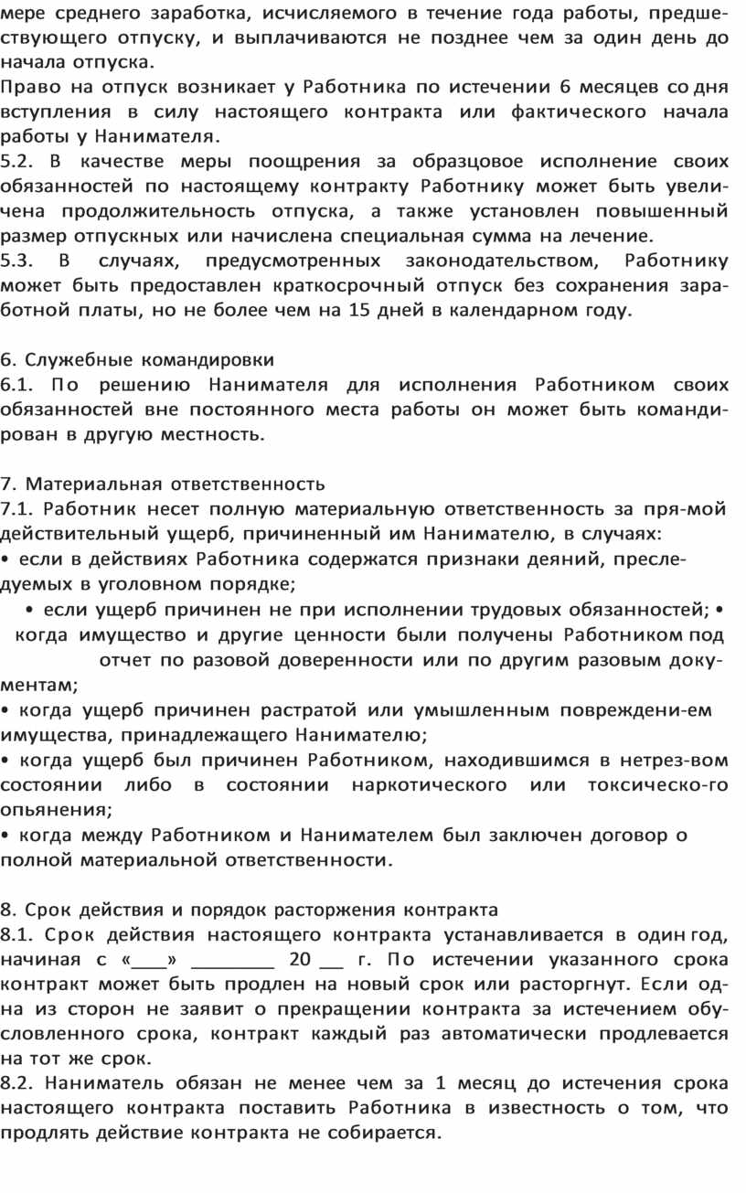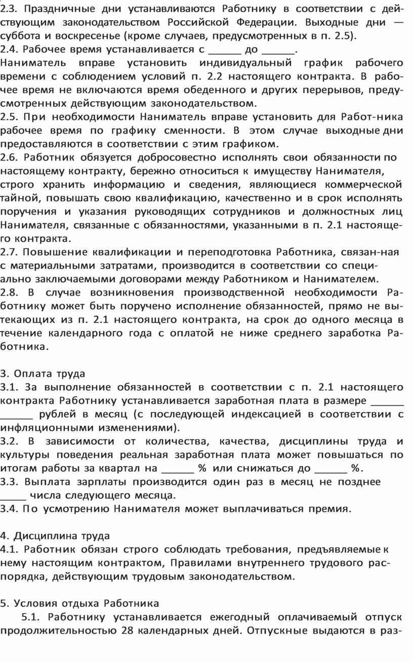 Примерный контракт найма на работу