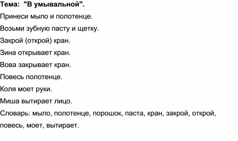 Словарь: мыло, полотенце, порошок, паста, кран, закрой, открой, повесь, моет, вытирает.
