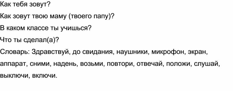 Словарь: Здравствуй, до свидания, наушники, микрофон, экран, аппарат, сними, надень, возьми, повтори, отвечай, положи, слушай, выключи, включи.
