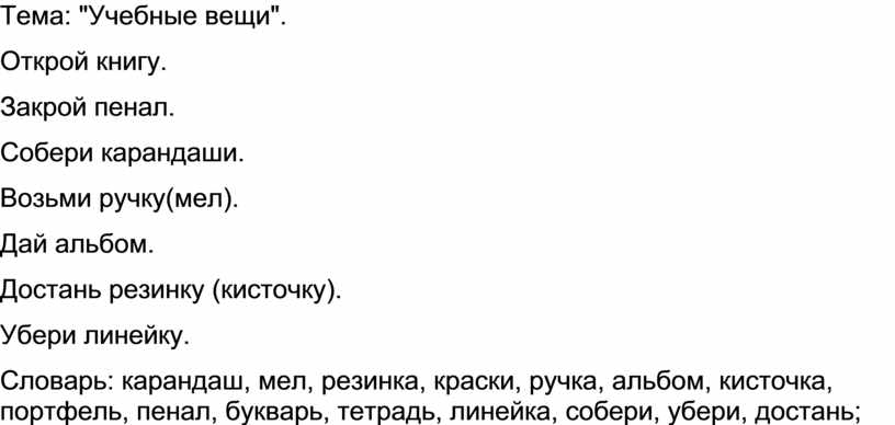 Словарь: карандаш, мел, резинка, краски, ручка, альбом, кисточка, портфель, пенал, букварь, тетрадь, линейка, собери, убери, достань;