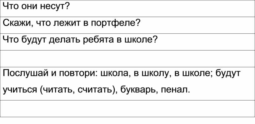 Послушай и повтори: школа, в школу, в школе; будут учиться (читать, считать), букварь, пенал. |