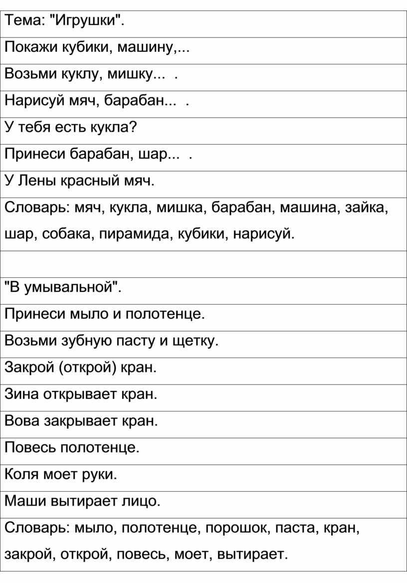 Словарь: мяч, кукла, мишка, барабан, машина, зайка, шар, собака, пирамида, кубики, нарисуй. |