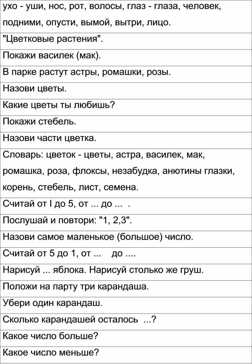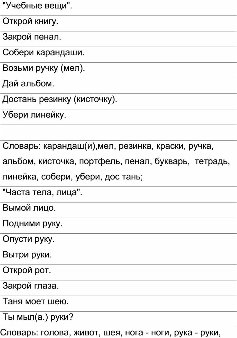 Словарь: голова, живот, шея, нога - ноги, рука - руки, ухо - уши, нос, рот, волосы, глаз - глаза, человек, подними, опусти, вымой, вытри, лицо. |