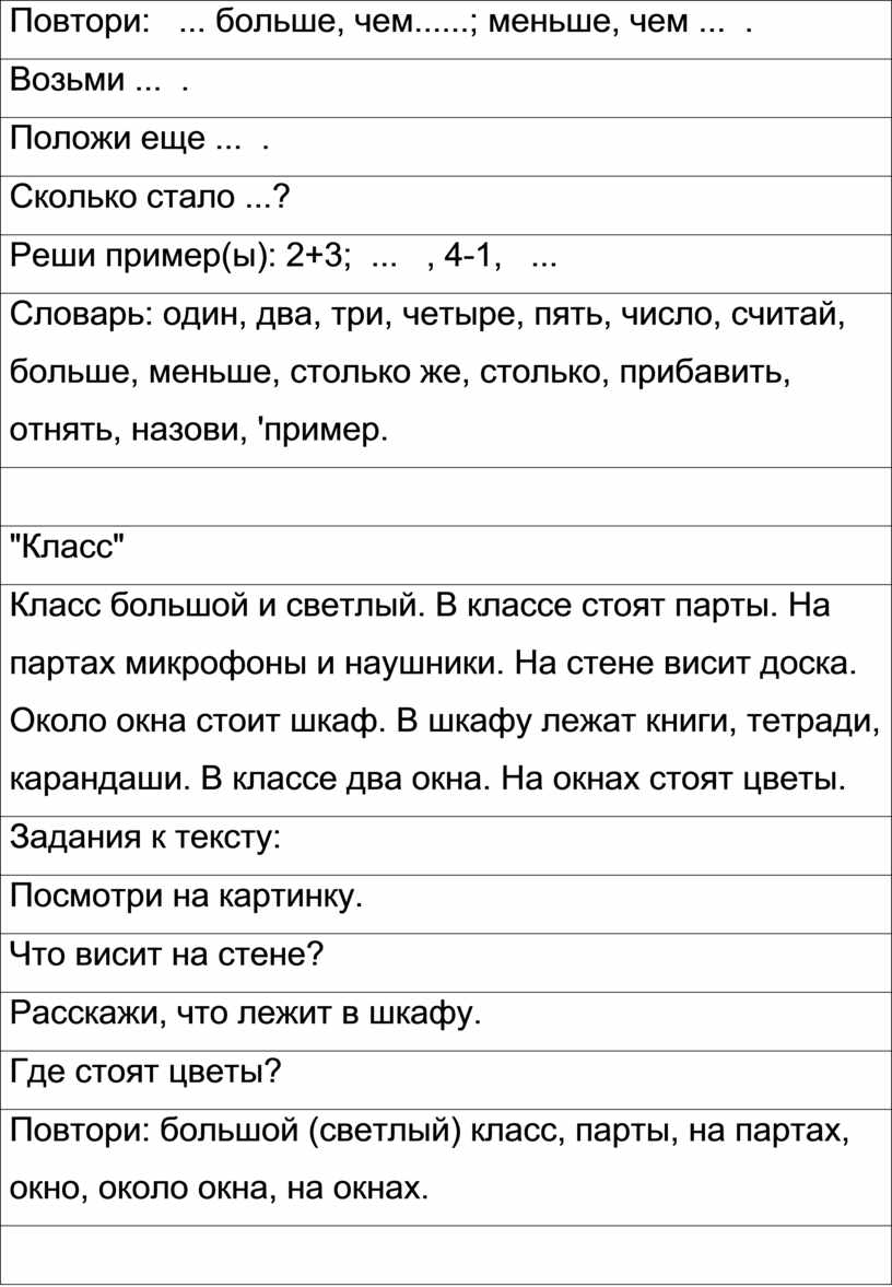 Словарь: один, два, три, четыре, пять, число, считай, больше, меньше, столько же, столько, прибавить, отнять, назови, 'пример. |