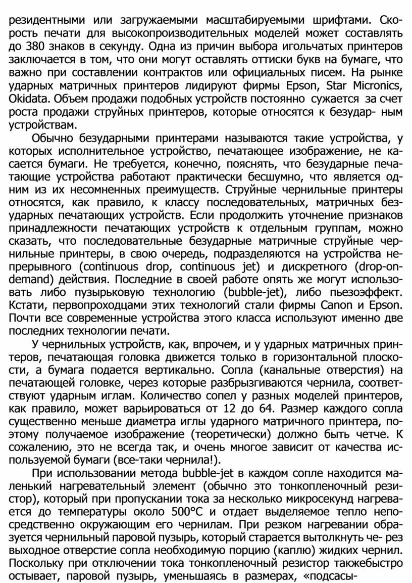 резидентными или загружаемыми масштабируемыми шрифтами. Ско- рость печати для высокопроизводительных моделей может составлять до 380 знаков в секунду. Одна из причин выбора игольчатых принтеров заключается в том, что они могут оставлять оттиски букв на бумаге, что важно при составлении контрактов или официальных писем. На рынке ударных матричных принтеров лидируют фирмы Epson, Star Micronics, Okidata. Объем продажи подобных устройств постоянно сужается за счет роста продажи струйных принтеров, которые относятся к безудар- ным устройствам.