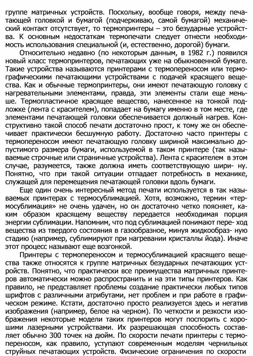 Принтеры с термопереносом и термосублимацией красящего веще- ства также относятся к группе матричных безударных печатающих уст- ройств. Понятно, что практически все преимущества матричных принте- ров автоматически можно распространить и на эти типы принтеров. Как правило, не представляет проблемы создание практически любых типов шрифтов с различными атрибутами, нет проблем и при работе в графи- ческом режиме. Кстати, достаточно просто реализуется здесь и негатив изображения (например, белое на черном). По четкости и резкости изо- бражения некоторые модели таких принтеров могут поспорить с хоро- шими лазерными устройствами. Их разрешающая способность состав- ляет обычно 300 точек на дюйм. По скорости печати принтеры с термо- переносом, как правило, уступают современным моделям чернильных струйных печатающих устройств. Физические ограничения по скорости