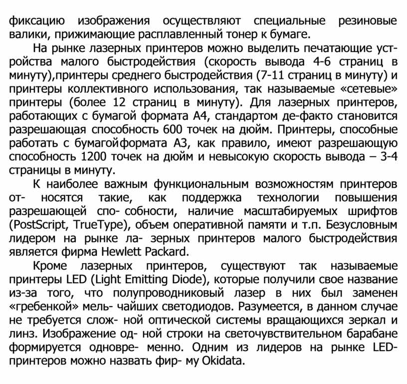 К наиболее важным функциональным возможностям принтеров от- носятся такие, как поддержка технологии повышения разрешающей спо- собности, наличие масштабируемых шрифтов (PostScript, TrueType), объем оперативной памяти и т.п. Безусловным лидером на рынке ла- зерных принтеров малого быстродействия является фирма Hewlett Packard.
