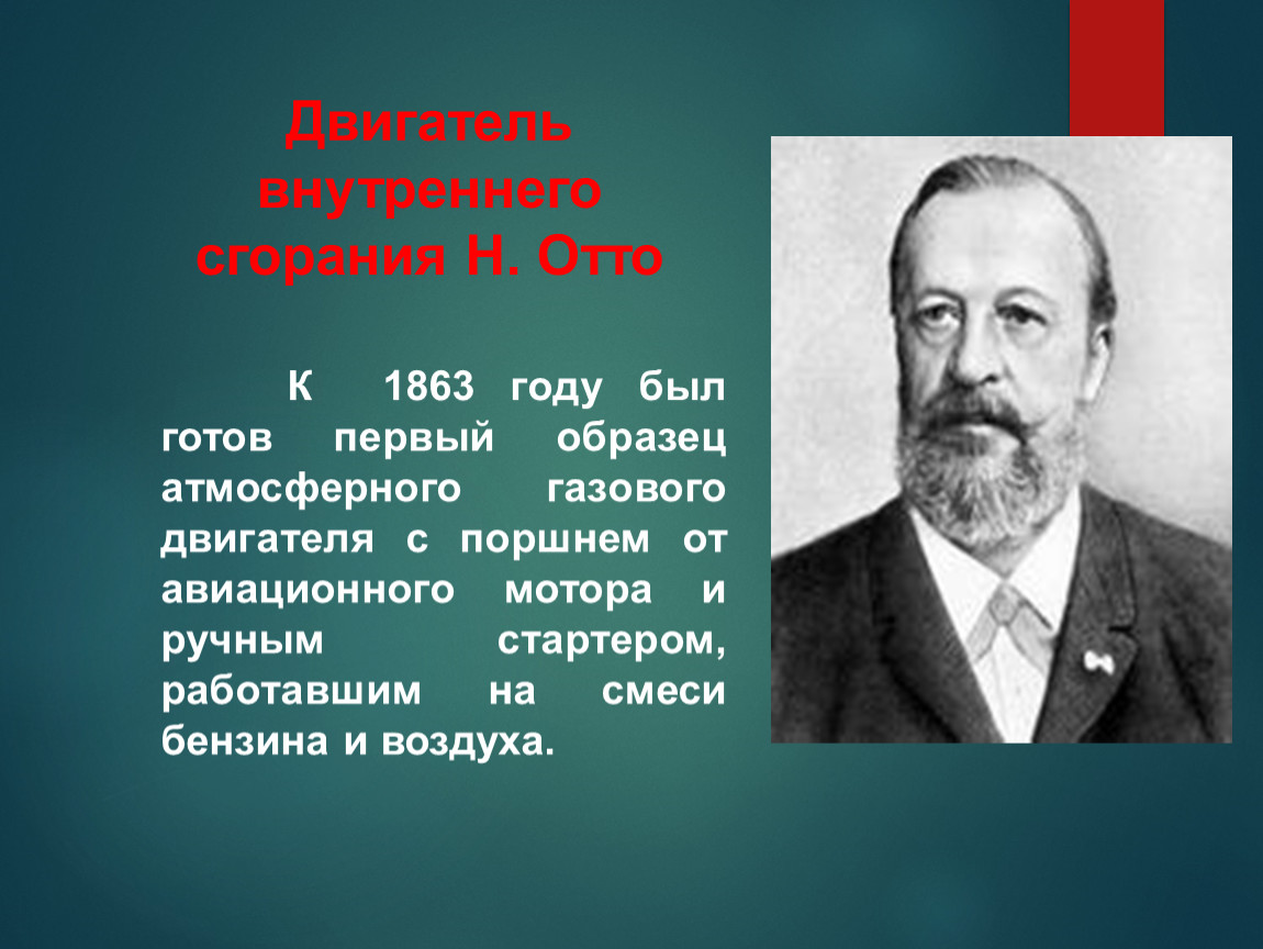 К 1863 году был готов первый образец атмосферного газового двигателя с поршнем от авиационного мотора и ручным стартером, работавшим на смеси бензина и воздуха.