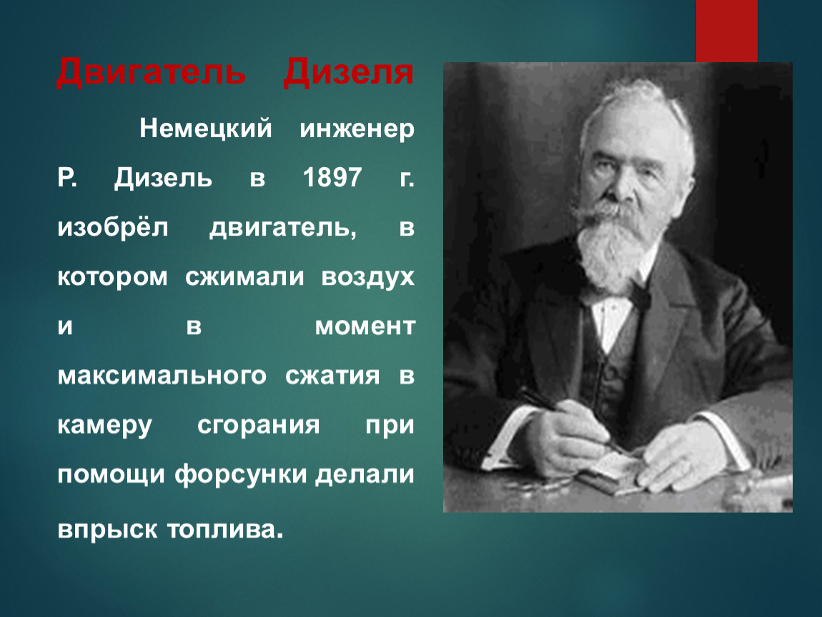 Двигатель Дизеля Немецкий инженер Р. Дизель в 1897 г. изобрёл двигатель, в котором сжимали воздух и в момент максимального сжатия в камеру сгорания при помощи форсунки делали впрыск топлива.