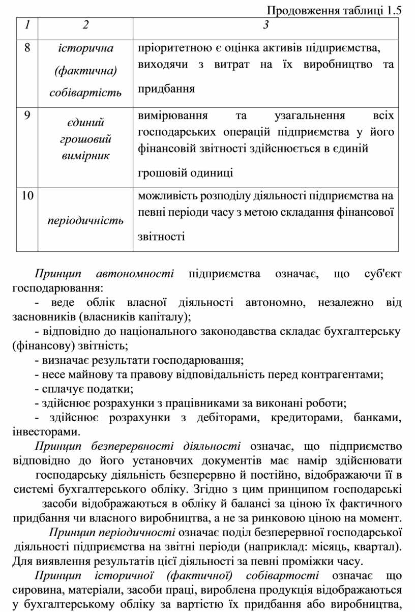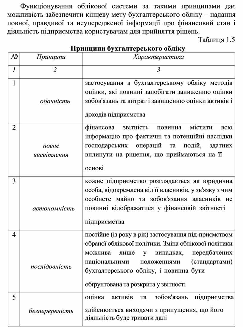 Відповідно до ст. 4 Закону України “Про бухгалтерський облік і фінансову звітність в Україні” бухгалтерський облік та фінансова звітність базуються на таких основних принципах (табл. 1.5):