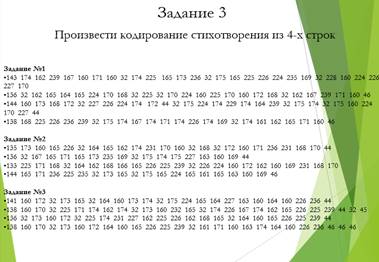Задание 4 Произвести кодирование стихотворения из 4-х строк. Одно стихотворение разбросано по всему классу, каждый ученик расшифровывает свою строчку и ищет свою группу строк среди одноклассников. (собирают стих)