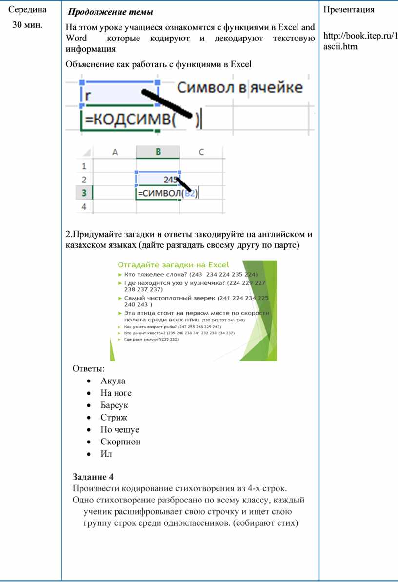 Продолжение темы На этом уроке учащиеся ознакомятся с функциями в Excel and Word которые кодируют и декодируют текстовую информация Объяснение как работать с функциями в Excel