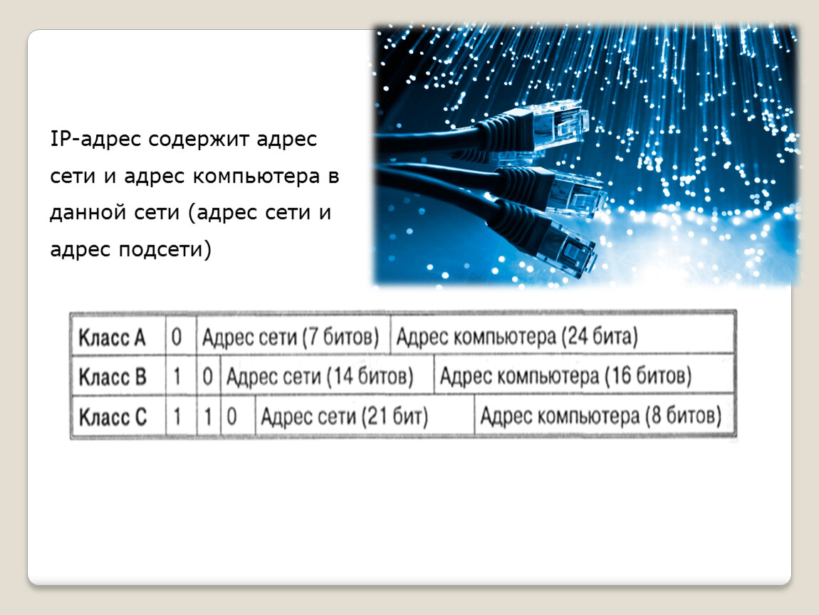 Первые биты адреса отводятся для идентификации класса, а остальные разделяются на адрес сети и адрес компьютера в сети.