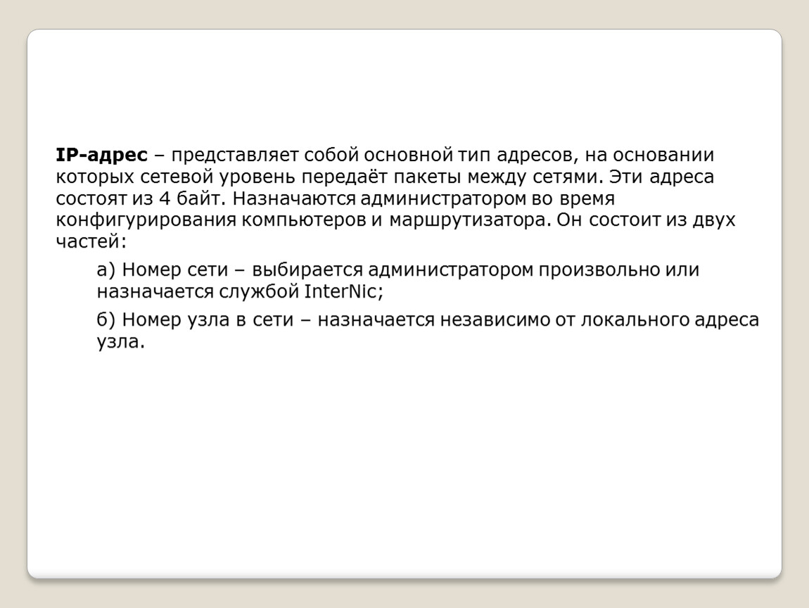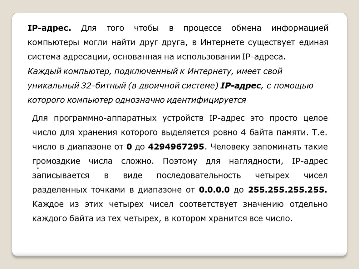 IP-адрес. Для того чтобы в процессе обмена информацией компьютеры могли найти друг друга, в Интернете существует единая система адресации, основанная на использовании IP-адреса.