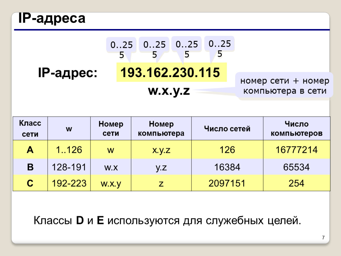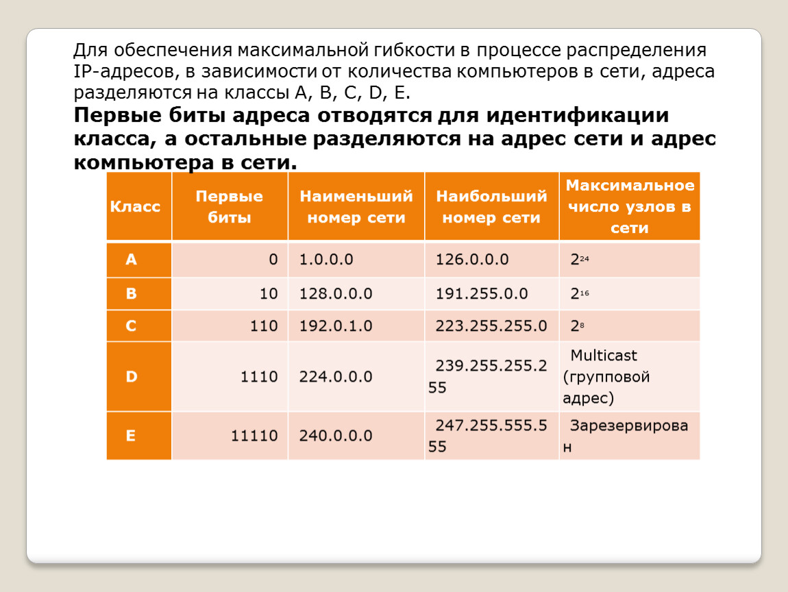 Для обеспечения максимальной гибкости в процессе распределения IP-адресов, в зависимости от количества компьютеров в сети, адреса разделяются на классы А, В, С, D, E.