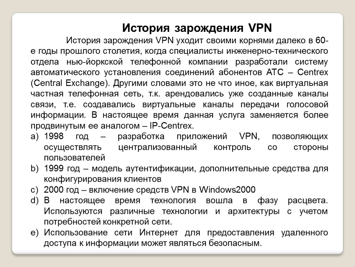 История зарождения VPN уходит своими корнями далеко в 60-е годы прошлого столетия, когда специалисты инженерно-технического отдела нью-йоркской телефонной компании разработали систему автоматического установления соединений абонентов АТС – Centrex (Central Exchange). Другими словами это не что иное, как виртуальная частная телефонная сеть, т.к. арендовались уже созданные каналы связи, т.е. создавались виртуальные каналы передачи голосовой информации. В настоящее время данная услуга заменяется более продвинутым ее аналогом – IP-Centrex.