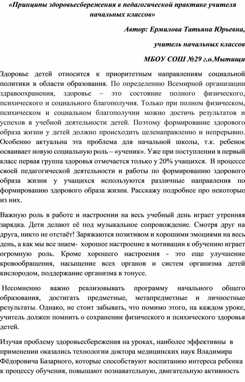 «Принципы здоровьесбережения в педагогической практике учителя начальных классов»