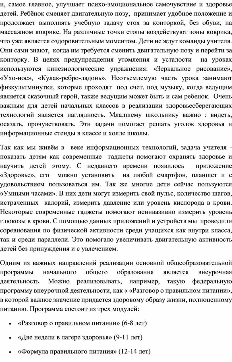 Так как мы живём в веке информационных технологий, задача учителя - показать детям как современные гаджеты помогают охранять здоровье и научить детей этому. С недавнего времени появилось приложение «Здоровье», его можно установить на любой смартфон, планшет и с удовольствием пользоваться им. Так же многие дети сейчас пользуются «Умными часами». В них дети могут измерить свой пульс, количество шагов, истраченных калорий, измерить давление или уровень кислорода в крови. Некоторые современные гаджеты помогают неинвазивно измерить уровень глюкозы в крови. С помощью данных приложений и устройств мы проводили соревнования по физической активности среди учащихся как внутри класса, так и среди параллели. Это помогало увеличивать двигательную активность детей без принуждения и с увлечением.