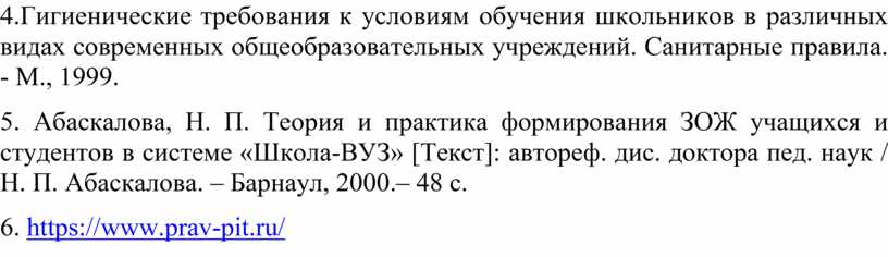 5. Абаскалова, Н. П. Теория и практика формирования ЗОЖ учащихся и студентов в системе «Школа-ВУЗ» [Текст]: автореф. дис. доктора пед. наук / Н. П. Абаскалова. – Барнаул, 2000.– 48 с.