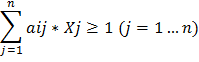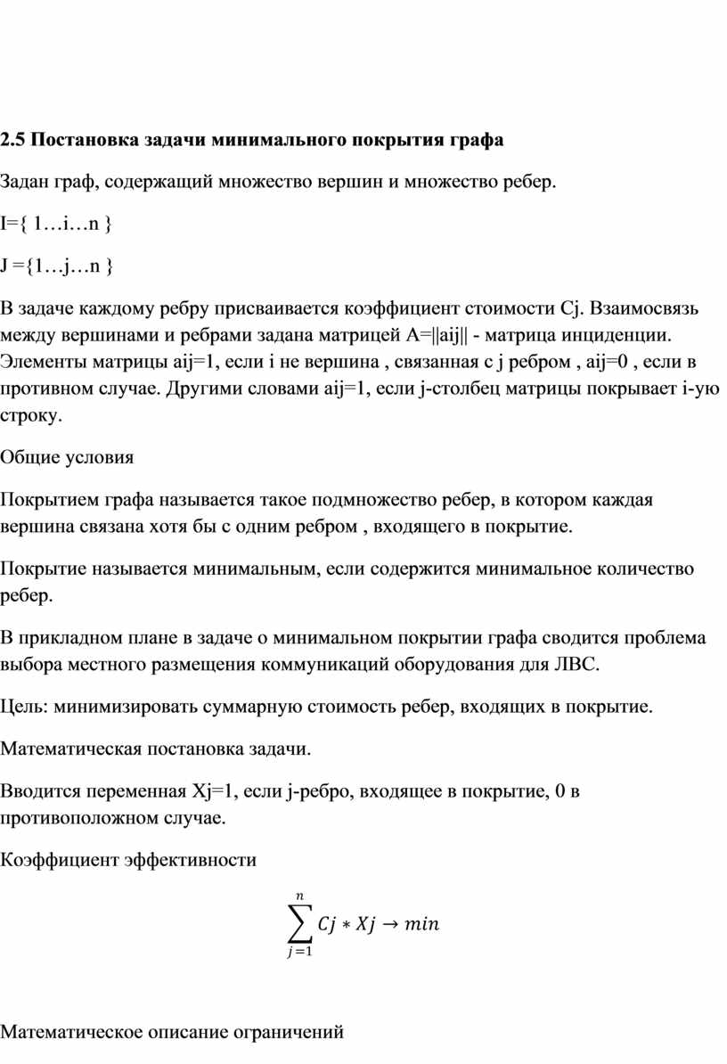 В задаче каждому ребру присваивается коэффициент стоимости Cj. Взаимосвязь между вершинами и ребрами задана матрицей А=||aij|| - матрица инциденции. Элементы матрицы aij=1, если i не вершина , связанная с j ребром , aij=0 , если в противном случае. Другими словами aij=1, если j-столбец матрицы покрывает i-ую строку.