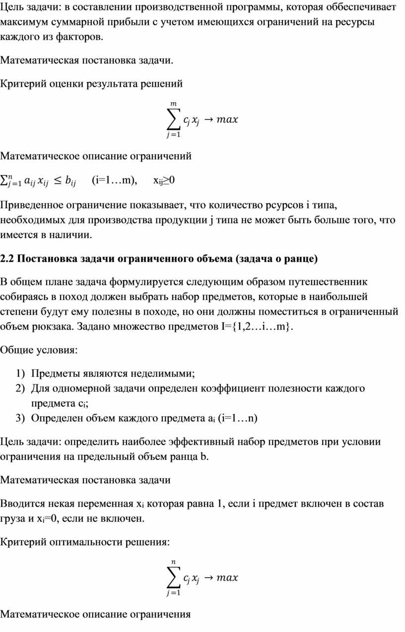 В общем плане задача формулируется следующим образом путешественник собираясь в поход должен выбрать набор предметов, которые в наибольшей степени будут ему полезны в походе, но они должны поместиться в ограниченный объем рюкзака. Задано множество предметов I={1,2…i…m}.