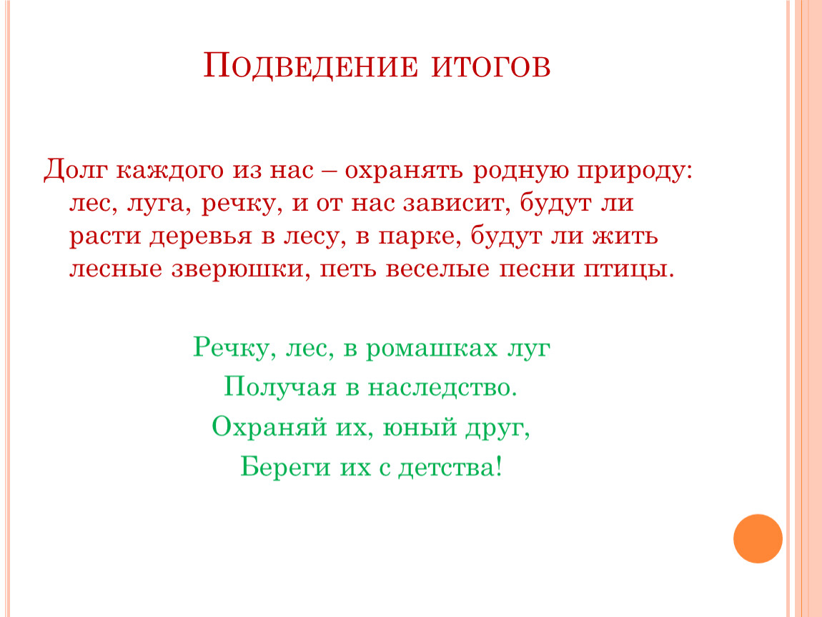 Долг каждого из нас – охранять родную природу: лес, луга, речку, и от нас зависит, будут ли расти деревья в лесу, в парке, будут ли жить лесные зверюшки, петь веселые песни птицы.