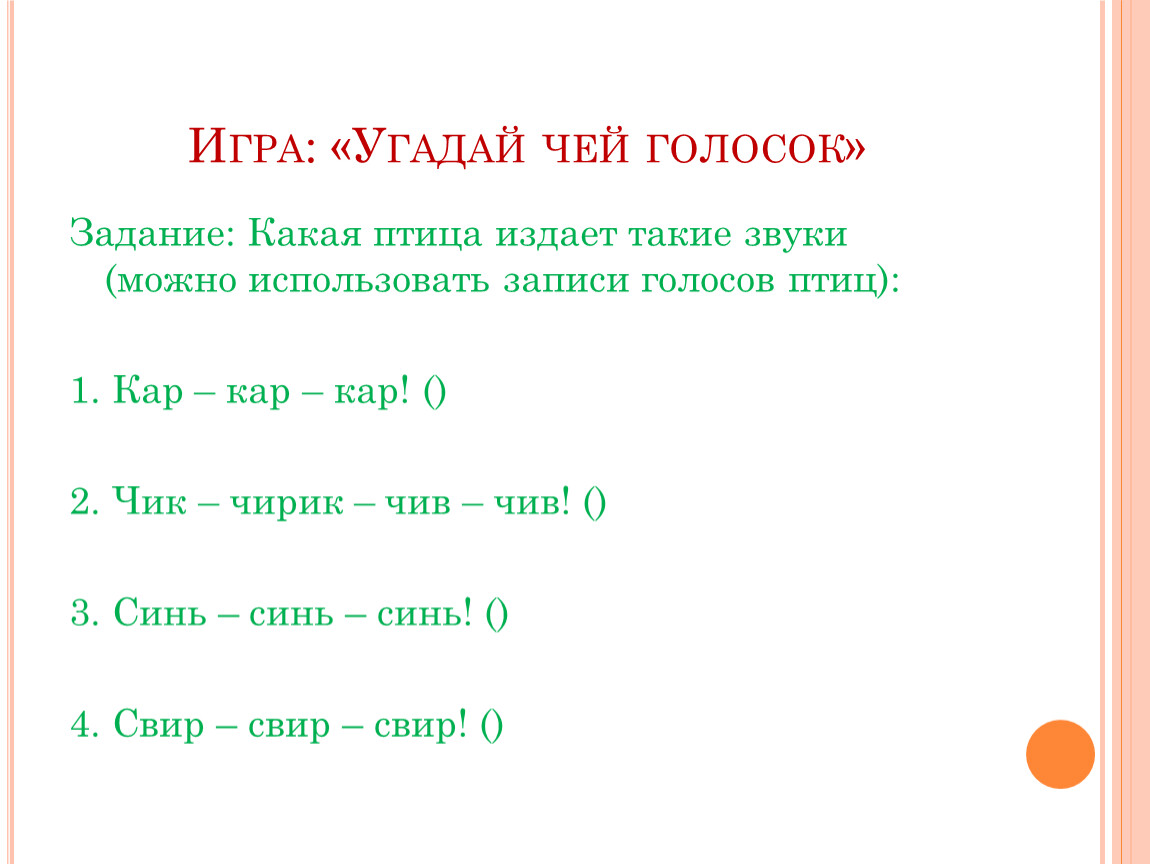 Задание: Какая птица издает такие звуки (можно использовать записи голосов птиц):