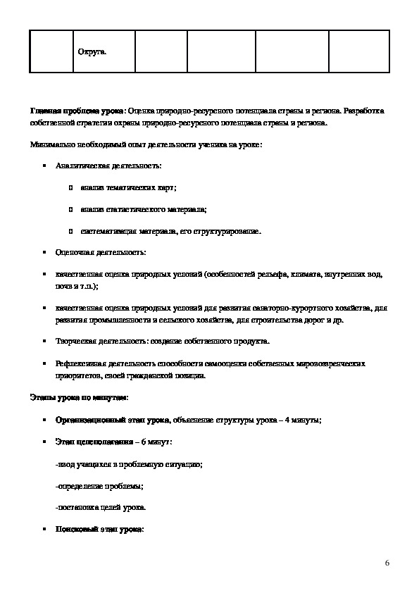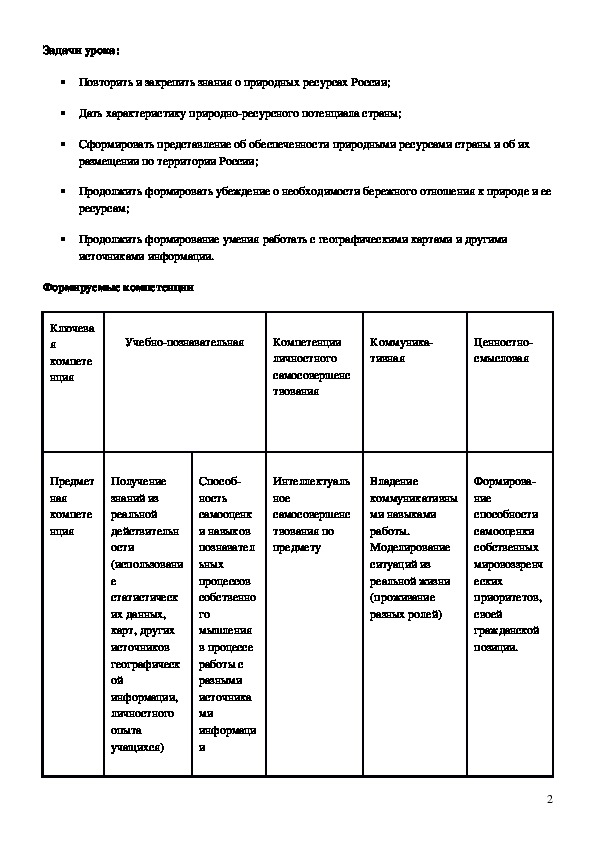 1. Образовательная: Составление учащимися системного образа природно-ресурсного потенциала России. Формирование у учащихся представления о природных условиях, о способе оценки природных условий для развития сельского хозяйства, санаторно-курортного хозяйства, для строительства дорог и др.