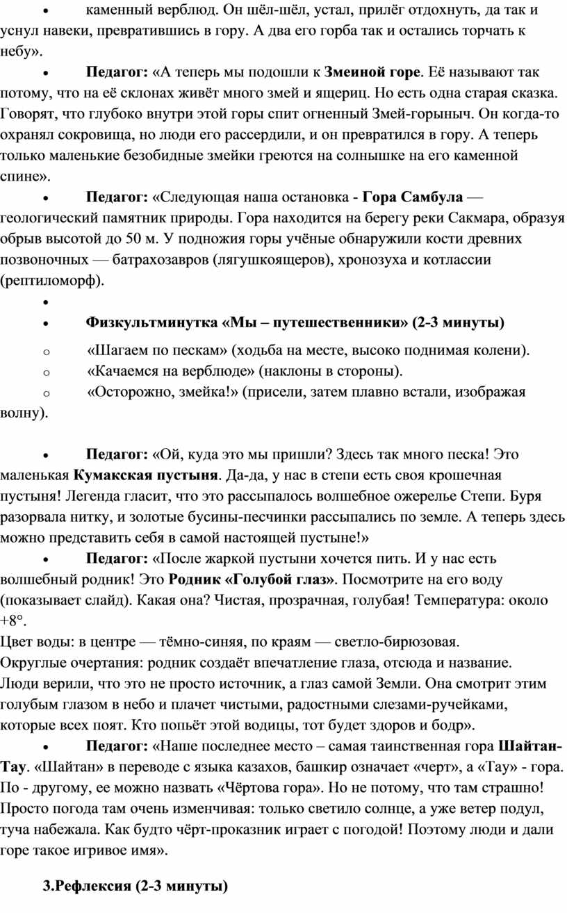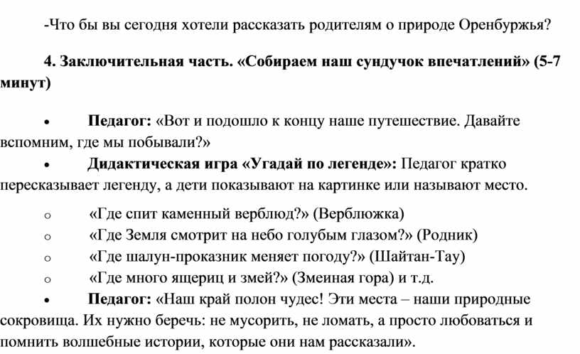 · Педагог: «Здравствуйте, мои юные друзья-путешественники! Сегодня у нас не обычный день, а волшебный. Мы с вами отправимся в удивительное путешествие по нашей родной Оренбургской земле. Мы посетим места, где живут самые настоящие сказки и легенды. Готовы? Тогда в путь!»