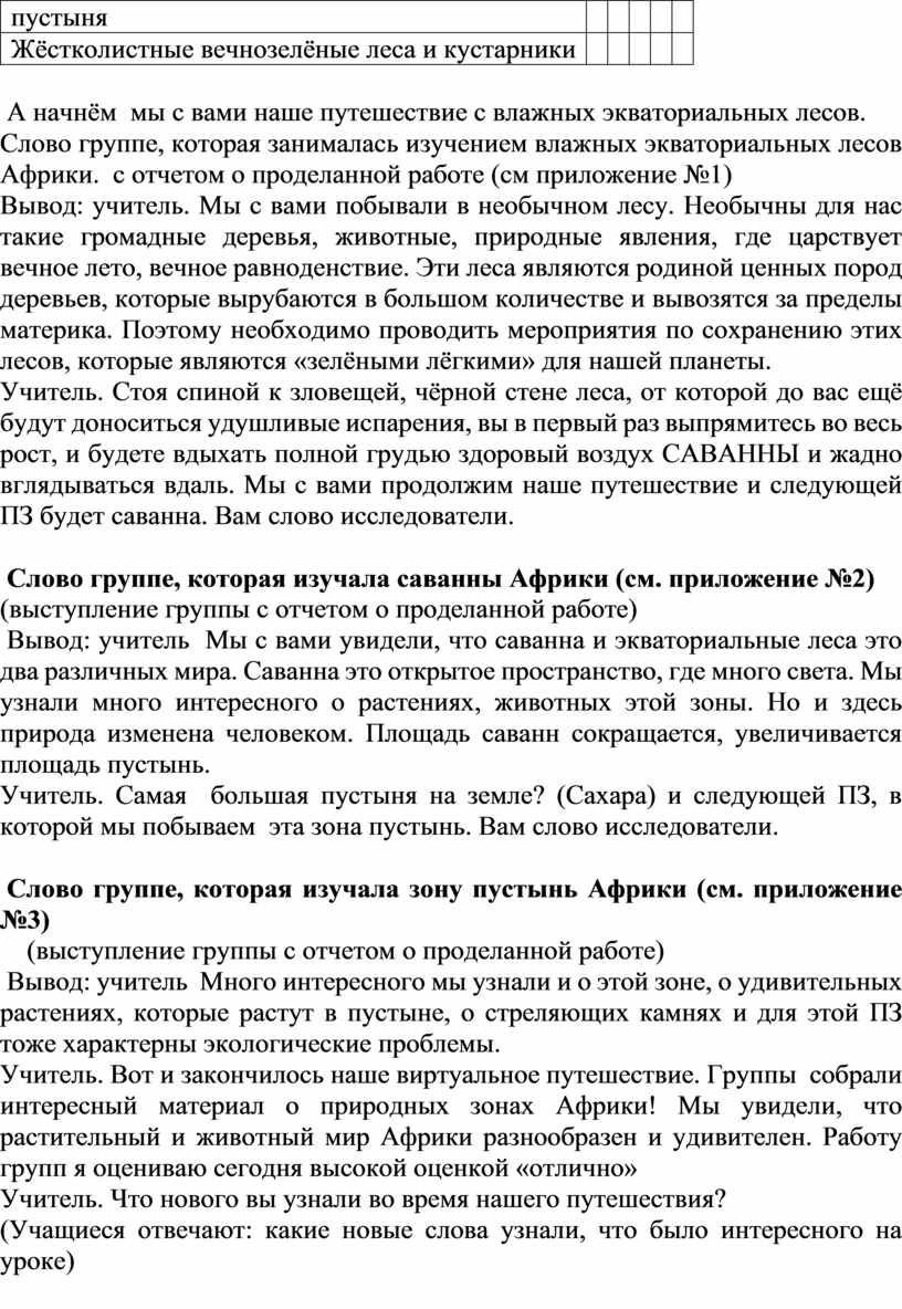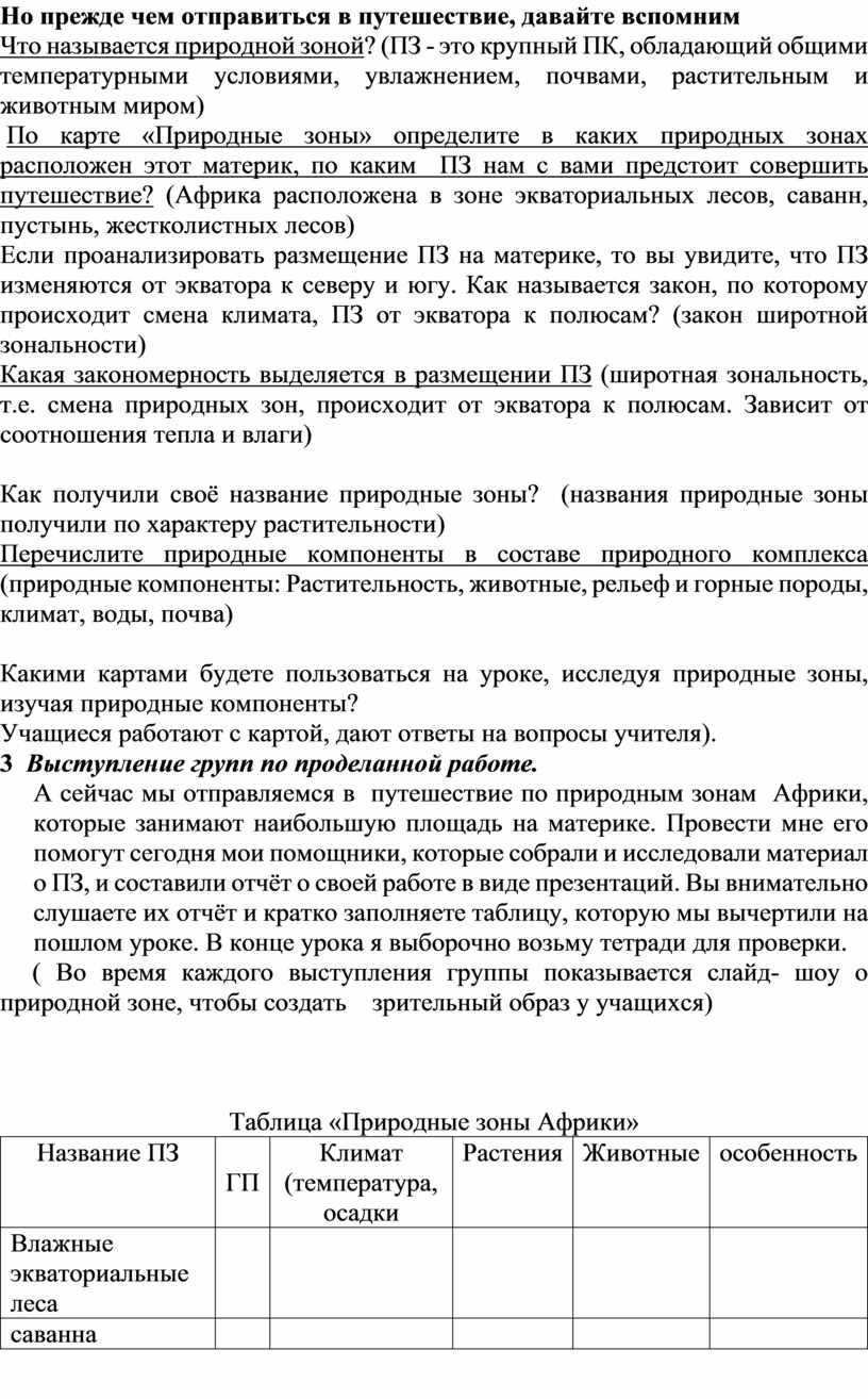 А сейчас мы отправляемся в путешествие по природным зонам Африки, которые занимают наибольшую площадь на материке. Провести мне его помогут сегодня мои помощники, которые собрали и исследовали материал о ПЗ, и составили отчёт о своей работе в виде презентаций. Вы внимательно слушаете их отчёт и кратко заполняете таблицу, которую мы вычертили на пошлом уроке. В конце урока я выборочно возьму тетради для проверки.