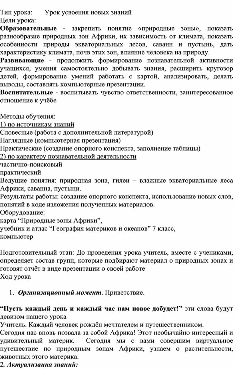 Подготовительный этап: До проведения урока учитель, вместе с учениками, определяет состав групп, которые подбирают материал о природных зонах и готовят отчёт в виде презентации о своей работе.