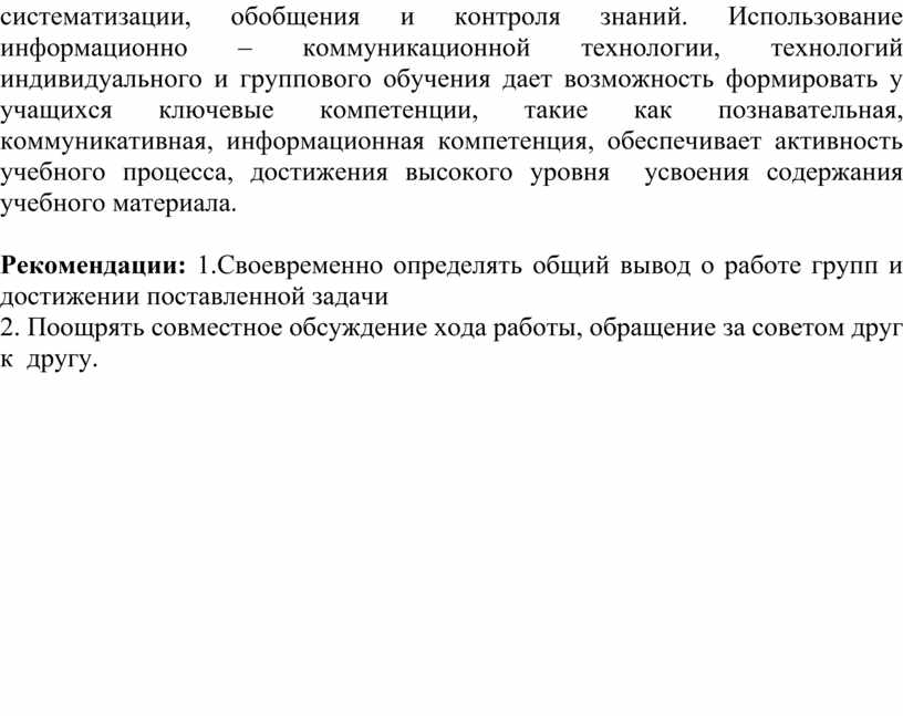 Рекомендации: 1.Своевременно определять общий вывод о работе групп и достижении поставленной задачи