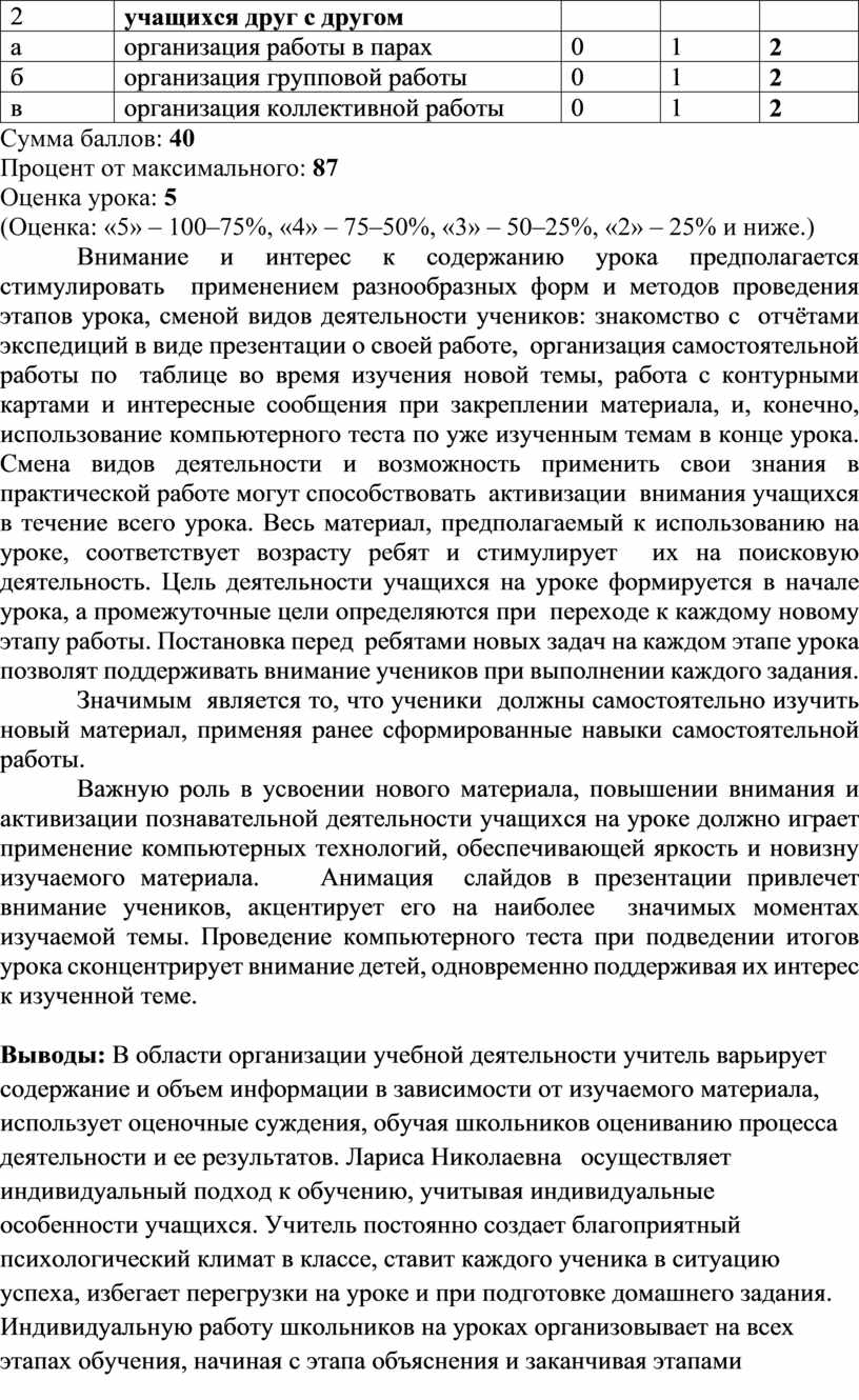 Выводы: В области организации учебной деятельности учитель варьирует содержание и объем информации в зависимости от изучаемого материала, использует оценочные суждения, обучая школьников оцениванию процесса деятельности и ее результатов. Лариса Николаевна осуществляет индивидуальный подход к обучению, учитывая индивидуальные особенности учащихся. Учитель постоянно создает благоприятный психологический климат в классе, ставит каждого ученика в ситуацию успеха, избегает перегрузки на уроке и при подготовке домашнего задания. Индивидуальную работу школьников на уроках организовывает на всех этапах обучения, начиная с этапа объяснения и заканчивая этапами систематизации, обобщения и контроля знаний. Использование информационно – коммуникационной технологии, технологий индивидуального и группового обучения дает возможность формировать у учащихся ключевые компетенции, такие как познавательная, коммуникативная, информационная компетенция, обеспечивает активность учебного процесса, достижения высокого уровня усвоения содержания учебного материала.
