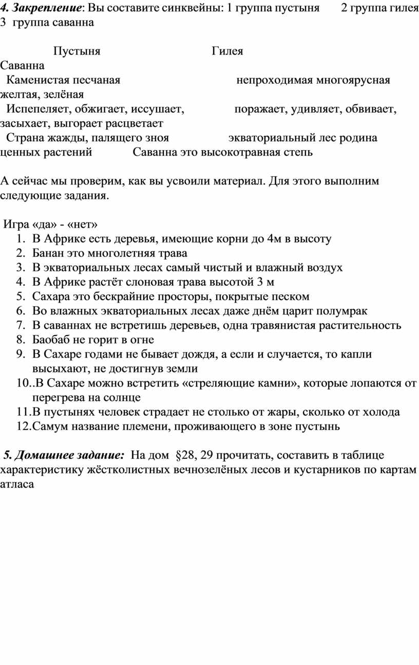4. Закрепление: Вы составите синквейны: 1 группа пустыня 2 группа гилея 3 группа саванна