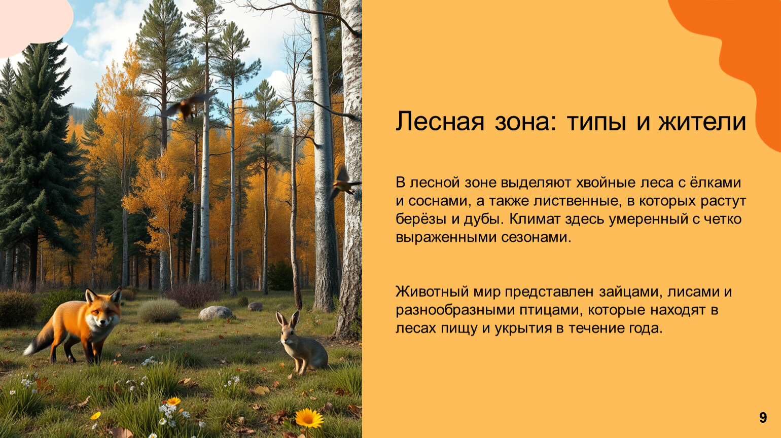 Лесная зона: типы и жители В лесной зоне выделяют хвойные леса с ёлками и соснами, а также лиственные, в которых растут берёзы и дубы. Климат здесь умеренный с четко выраженными сезонами. Животный мир представлен зайцами, лисами и разнообразными птицами, которые находят в лесах пищу и укрытия в течение года.