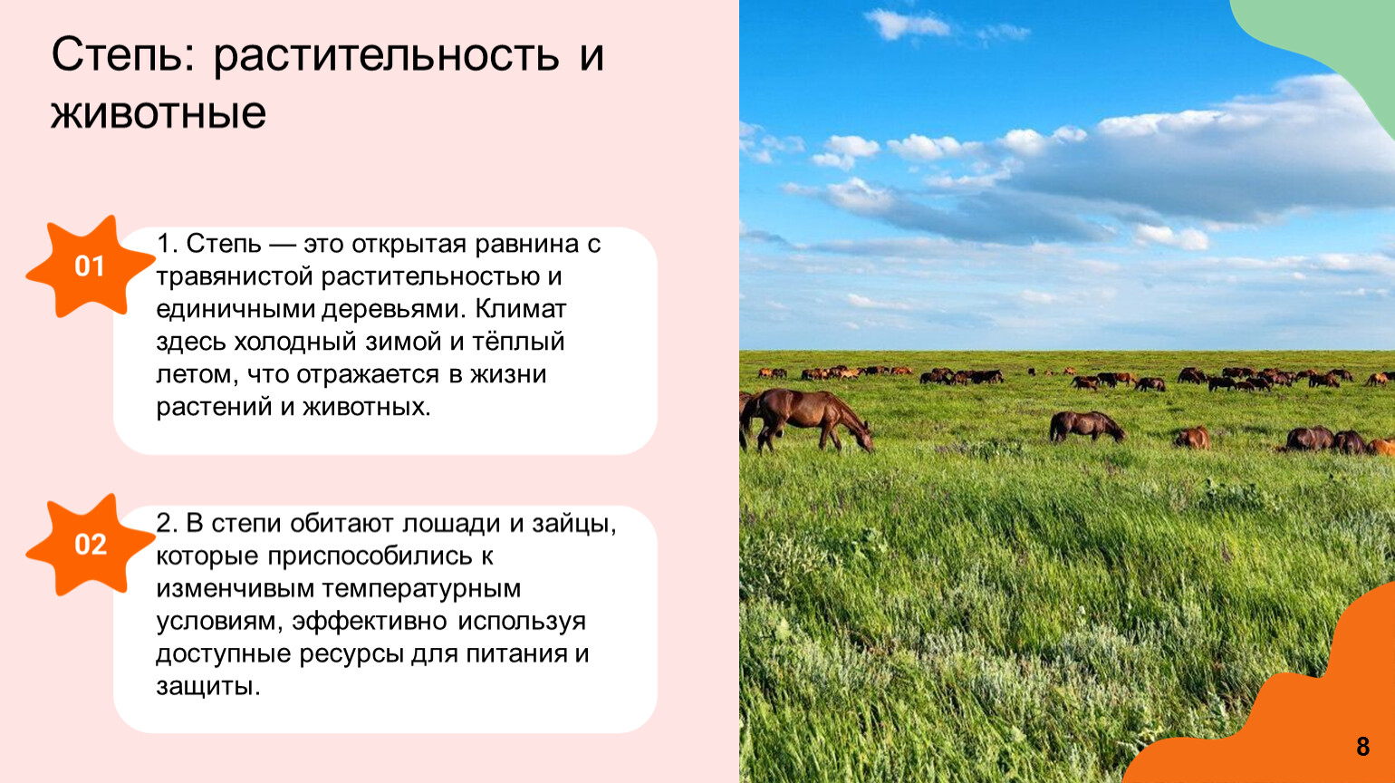 1. Степь — это открытая равнина с травянистой растительностью и единичными деревьями. Климат здесь холодный зимой и тёплый летом, что отражается в жизни растений и животных.