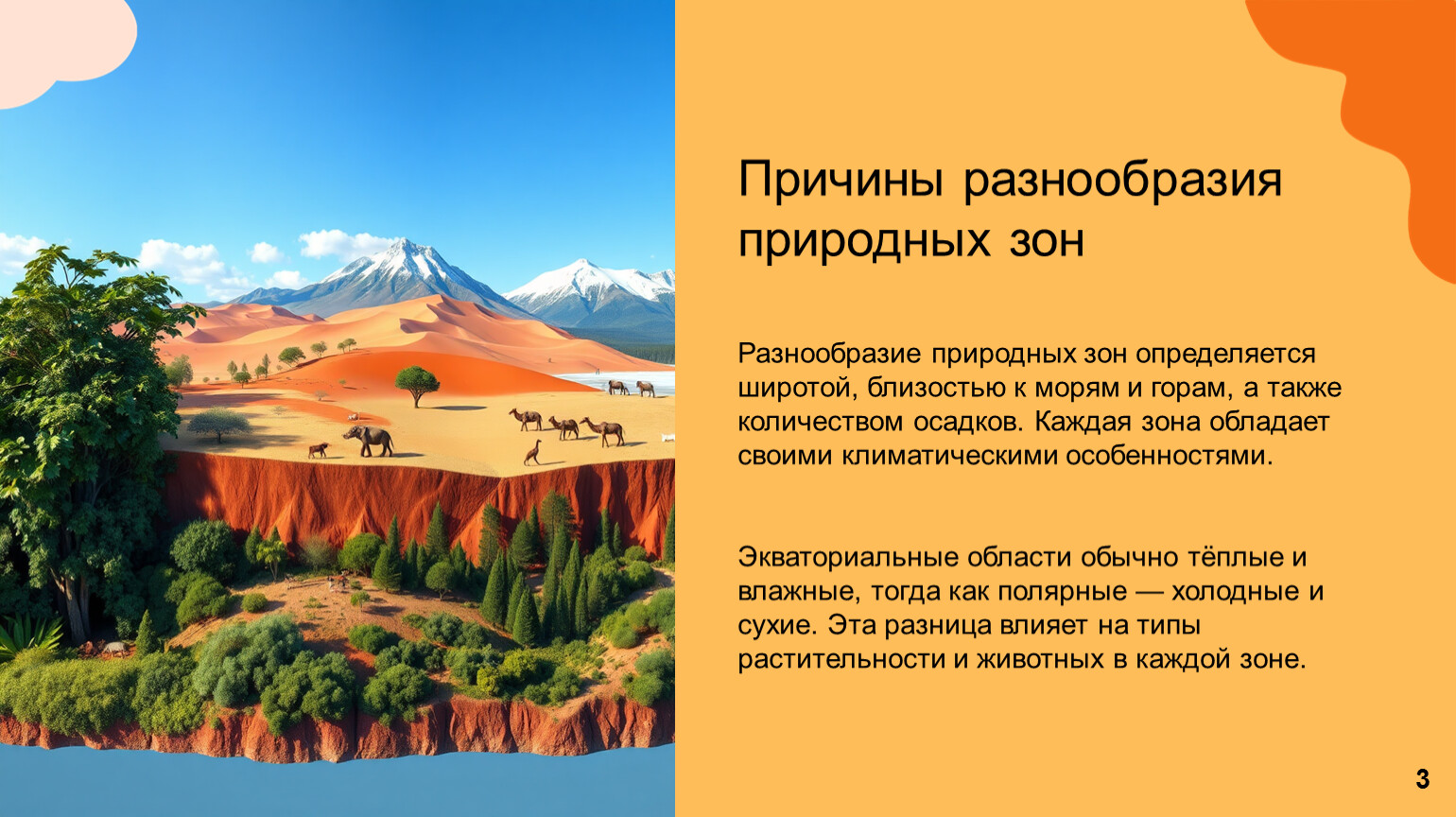 Причины разнообразия природных зон Разнообразие природных зон определяется широтой, близостью к морям и горам, а также количеством осадков. Каждая зона обладает своими климатическими особенностями. Экваториальные области обычно тёплые и влажные, тогда как полярные — холодные и сухие. Эта разница влияет на типы растительности и животных в каждой зоне.