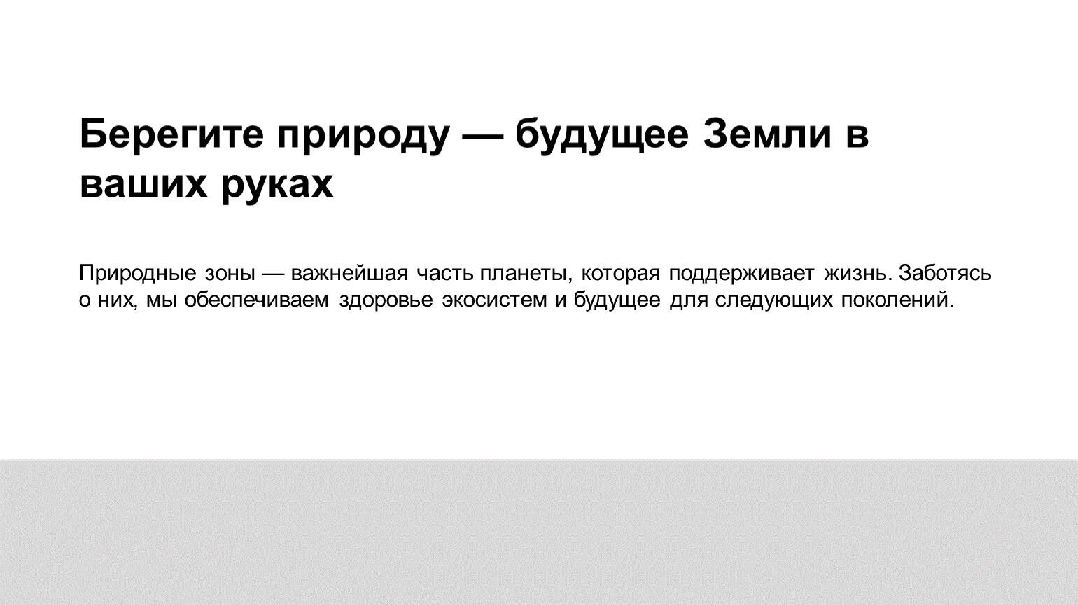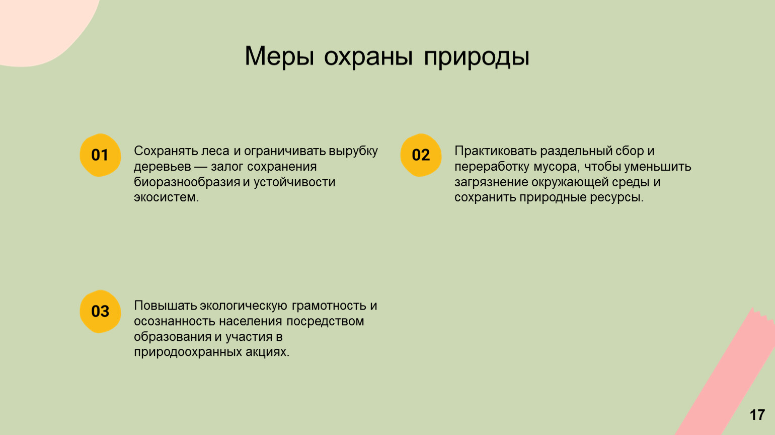 Современные меры охраны Внедряются программы восстановления природных зон, охраны редких видов, а также ограничения вредных антропогенных воздействий.